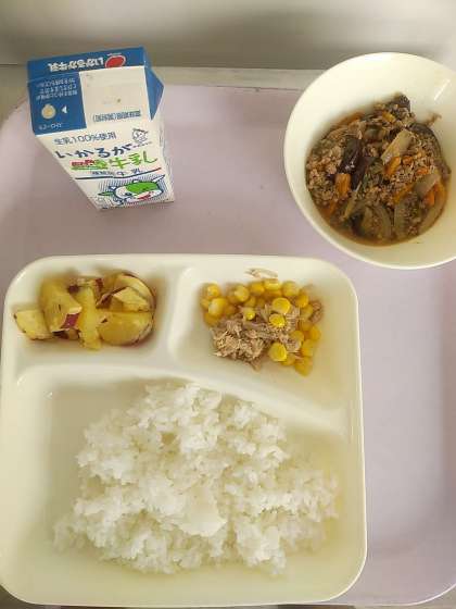 献立は、ごはん、牛乳、マーボーなす、ツナと野菜の炒めもの、焼きさつまいもの甘みつかけです。