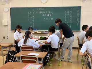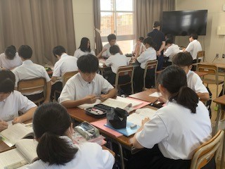 「壁に残された伝言」という手記を読み、先生から出された設問について、班で意見を出し合いまとめました。その後、枕草子の暗唱練習をしました。