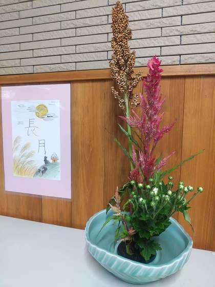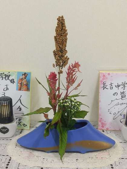 元気アップコーディネーターの松尾さんに花を生けていただきました。玄関と校長室がとても明るい雰囲気です。花はキビ、ケイト、小菊です。毎月、ありがとうございます。