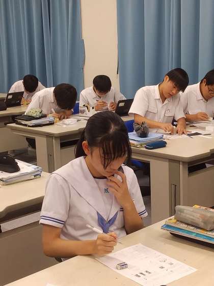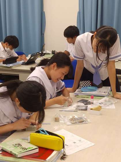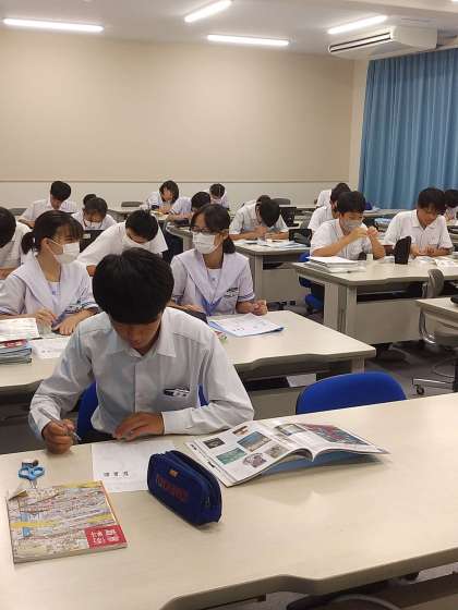 てん刻をしています。デザインを自分で考えながら、できた生徒から実際に掘り始めています。手を真っ白にしながら進めている生徒やデザインに悩んでいる生徒など、みんな一生懸命に取り組んでいます。