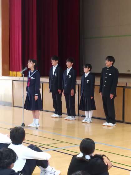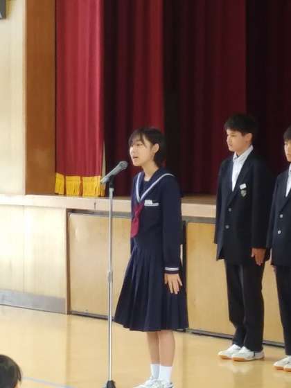 認証式に続き、前期生徒会役員の挨拶がありました。塩川 前期生徒会長が今までの1年間を振り返り「大変だったことなどが自分自身の成長につながりました。」とあいさつをしました。これからの生徒会役員に頑張って欲しいとメッセージを送りました。