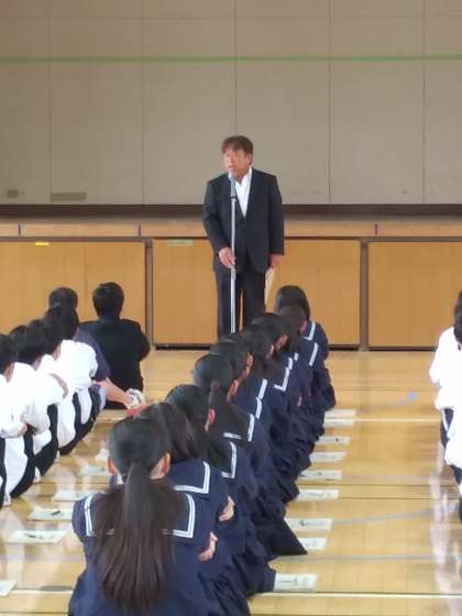 生徒会役員の認証式や所信表明の後、定例の全校集会を行いました。