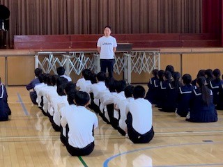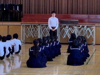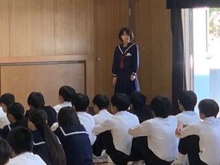 定例の3年学年集会です。学級代表から「後期の学年目標について、文化発表会に向けての取り組みについて」話しがありました。その後、合唱コンクールの体形確認を行いました。