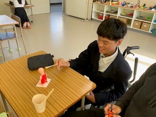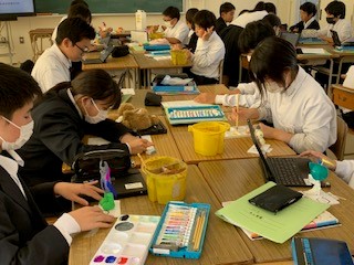 1年3組は美術です。紙粘土で自分オリジナルの「こびと」を作成し、着色、ニス塗り、完成後動画製作に取り組んでいます。