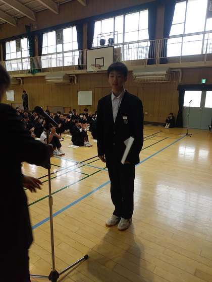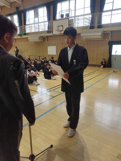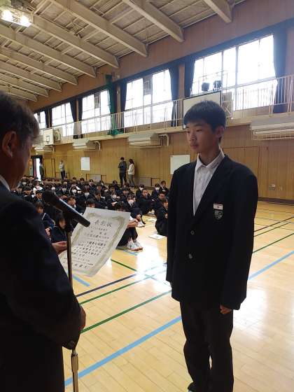 全校集会の前に伝達表彰を行いました。バスケットボール部員が表彰されました。