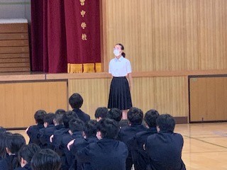 「生計を立てるためにはもちろんですが、働くことによって周りの人が助かったり幸せになったりと人の役に立つことができます。また、みなさんは、将来の夢を持っていますか?自分をみつめ、自分を生かすために1年生でのキャリア教育、2年生の職場体験へと繋げ、自分が興味あること・頑張れることを見つけてください。そして、将来の夢をもち、それに向かう進路を目指してください。」