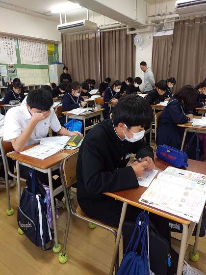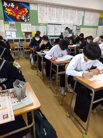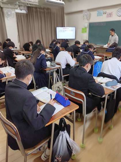 裁判員裁判を題材にして、制度の確認した後、動画を視聴しどのように判断すれば良いのか、班に分かれて意見を出し合いました。意見もたくさん出て、互いの意見を聞きながら、自分の分の意見と比較していました。最後に、自分が出した結論を発表しました。