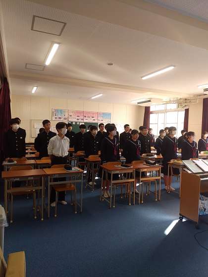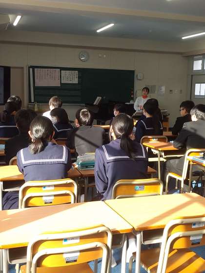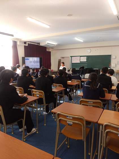 「帰れソレント」を全員で歌唱し、その後、サン・サーンスについて学習しました。サン・サーンスが作曲した曲を聞き、何をイメージして作曲されたのか班で考え、発表しました。