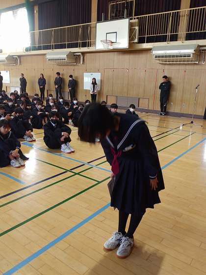 第2学期終業式で校長先生からの式辞に引き続き、3年塩川さんへ税に関する作文の伝達表彰を行いました。記念品と共に贈られました。