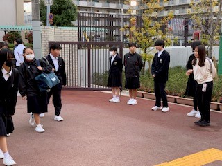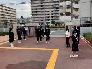 登校の様子です。今日は、生徒会役員と2、3年学級代表が、元気に挨拶を交わしています。