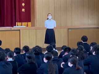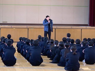 「29年前の今日、阪神淡路大震災で未曾有の被害がありました。先日には能登半島地震もありましたが、数多くの自然災害に備えて『防災・ボランティアの日』が、この17日に設定されています。今週の土曜授業での防災学習にしっかり取り組みましょう。」「この3学期は、2年生の0学期といわれます。次の学年の準備期間としてのみなさんの成長を期待します。」「インフルエンザ、風邪などの欠席がふえています。こまめな手洗い、換気など予防措置をしっかりとりましょう。」