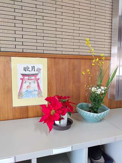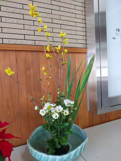 花はレンギョウ、アイリス、小菊です。元気アップコーディネーターの松尾さん、毎月ありがとうございます。花があるおかげで、明るい雰囲気をつくれます。