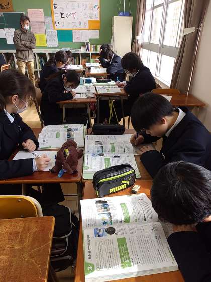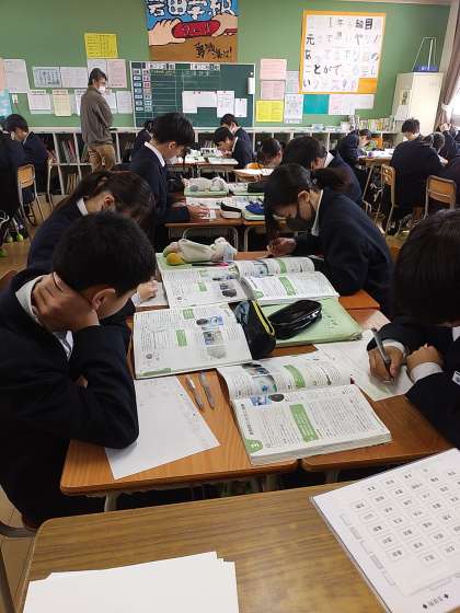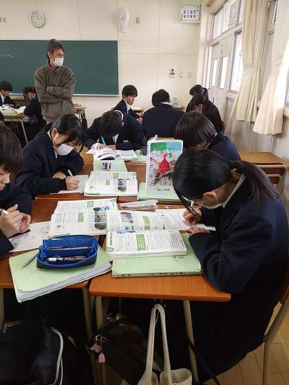 班に分かれて放射線の特徴を1一人ひとりがまとめる形式で授業を進めました。放射線の歴史的な発見やその利用についてまとめました。