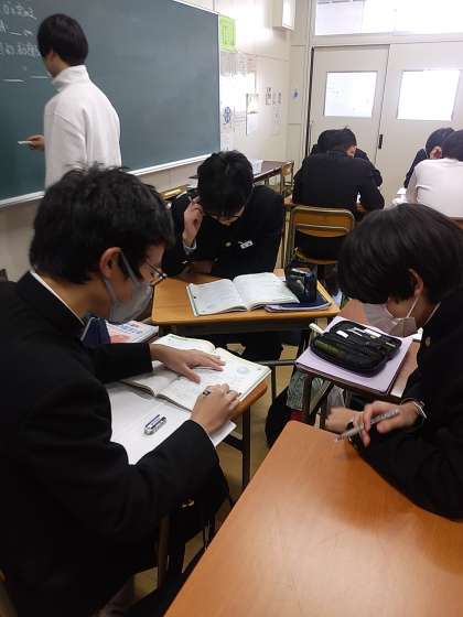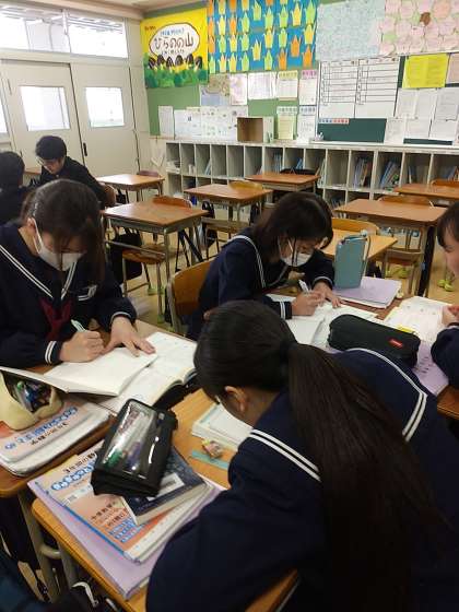 班に分かれて、図形の問題を教え合いながら、解いていました。とても良い雰囲気の中でのグループ学習でした。
