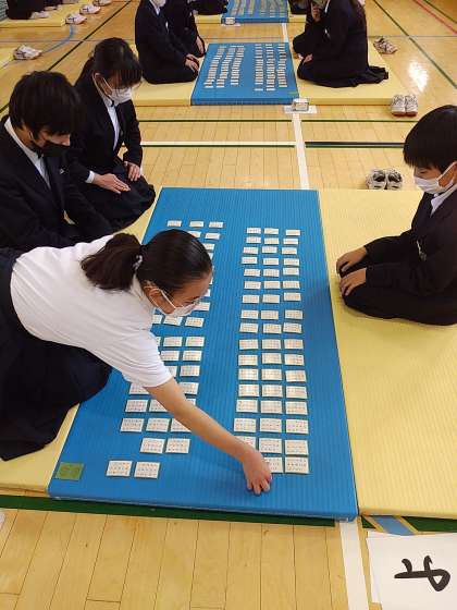 1年生で百人一首大会を行いました。真剣なまなざしで、取り札を見つめながら、誰よりも早く取ろうとしている姿が印象的でした。歌を聞く時間、取る瞬間、そして取り終わった時の歓声が繰り返されていきます。1つのことに集中した時の力を感じました。一生懸命な時の楽しさを感じてくれれば嬉しいです。