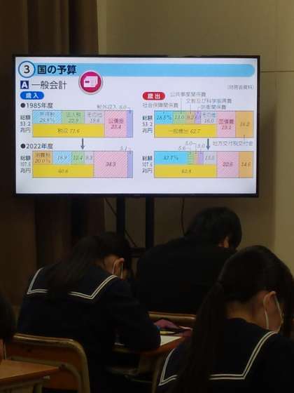 財政政策とその課題について学習しました。財政のグラフを年度別に比べた場合どういったことがいえるのか、また課題は何なのかを考え発表しました。周りの友達とも相談しながら授業を進めました。とても雰囲気の良い授業でした。