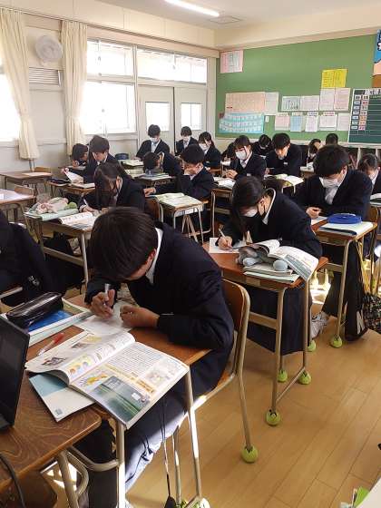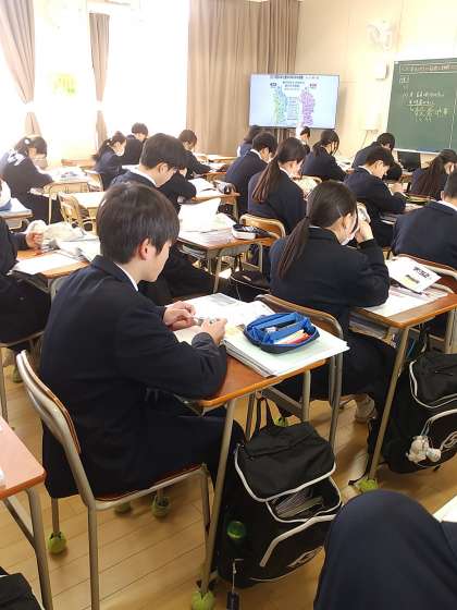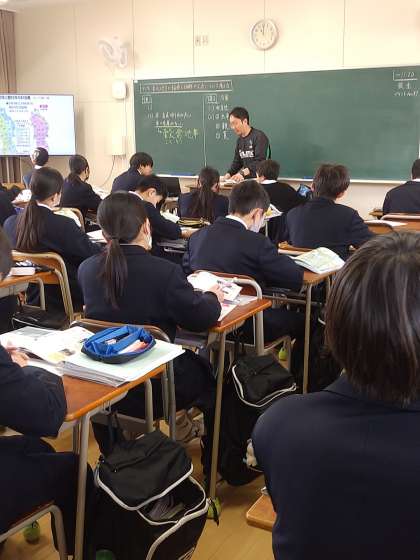東北地方の稲作と畑作の工夫について考える授業を行いました。東北地方にふく、冷たく湿ったかぜ「やませ」のため、稲作・畑作ともに影響を受けます。他の地方に比べて霧の発生も多く、日照時間が短くなてしまうことからどのような工夫が必要なのか考えました。始めは個人それぞれが考え、次に班に分かれて互いに意見を交換しました。学びを深められる授業でした。