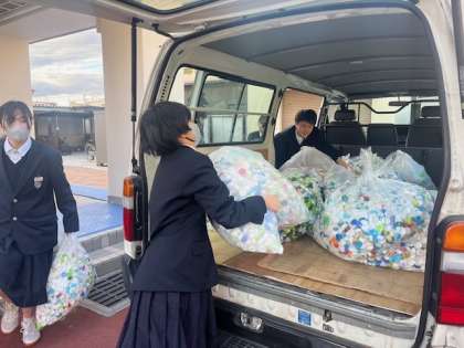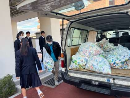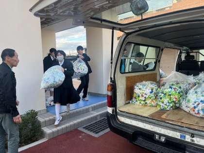 今日は、ペットボトルキャップ回収活動で集めたペットボトルキャップを業者の方に回収していただきました。