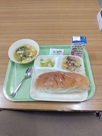 今日の献立はパン、牛乳、中華おこわ、卵スープキャベツのオイスターソース炒めです。