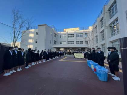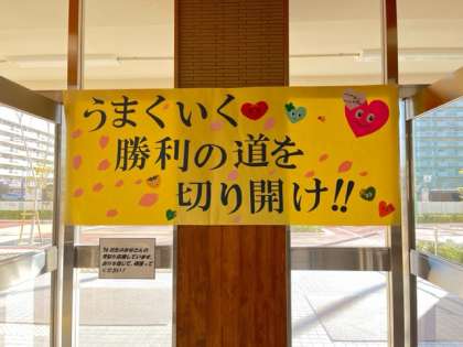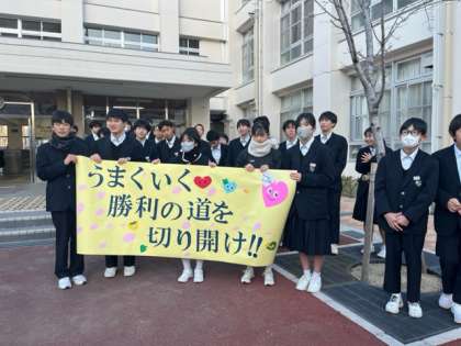 本日朝7:55から、土曜日にある私立の高校入試を受験する3年生たちに向けて、生徒会主催で受験応援あいさつ運動を行いました。