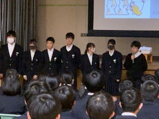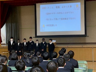 先日行われた校外学習(京都班別散策)のまとめとして、各班の振り返りをパワーポイントにまとめ発表会を行いました。クイズをだしたり、京都の風景や動画もあったりと工夫を凝らしたものでした。良かった点、反省点、そして見通しまで述べられている班がほとんどで、この1年間の77期生の成長を改めて確信できるものでした。これからどんな成長を遂げてくれるか楽しみです。