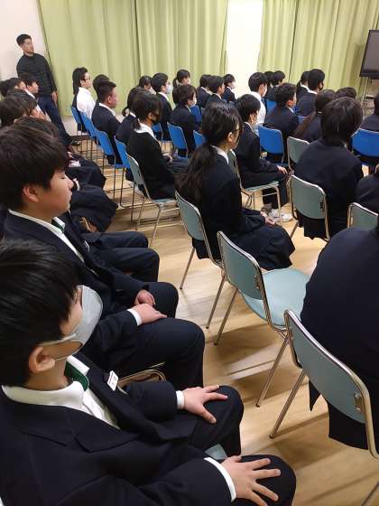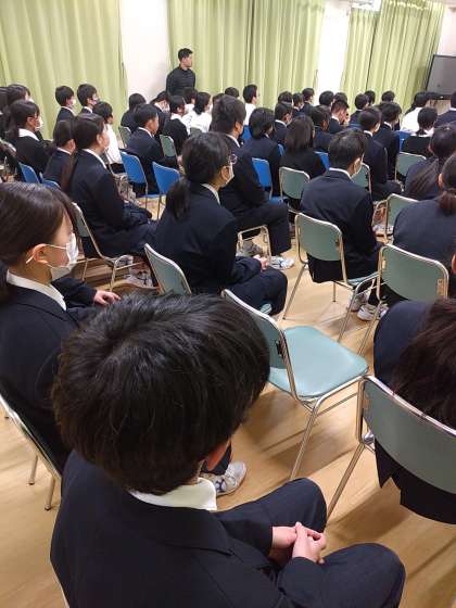 「企業家」とはどういった人をいうのか、日本の企業家にはどんな人がいるのか、特に関西にゆかりのある起業家は誰かなどについて話をしていただきました。チキンラーメンを考えた安藤百福さんについてアニメも交えながら分かりやすく話をしていただきました。生徒も興味をもちながら、真剣な表情で聞いていました。