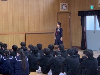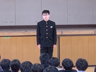 「いろいろな場所・教室での様々な活動を当たり前のようにしてきたみなさんのこの中学校3年間の努力、そしてその成長には目を見張るものがあります。周りから沢山の刺激・影響・学びをもらってきたことと思いますが、残りの中学校生活ではその刺激・影響・学びを後輩である1、2年生に与え繋げていってください。」とお話しがありました。