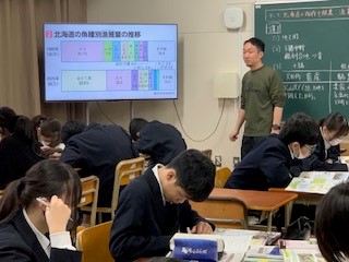 1組は社会です。北海道の畑作、酪農、漁業の特色について、与えられた課題をグループで考え確認しました。
