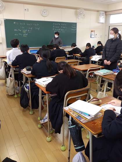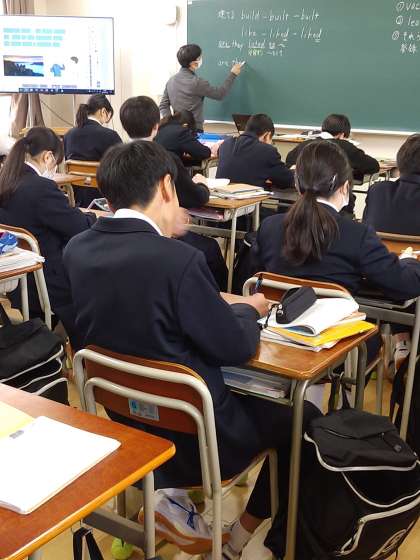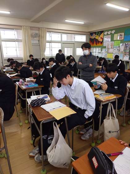 学年末テストの主要な範囲である受身形について復習しながら授業を進めました。単語の意味を調べながら、日本語訳にしていきました。テスト前独特の緊張感のある授業でした。