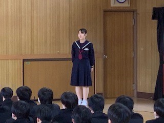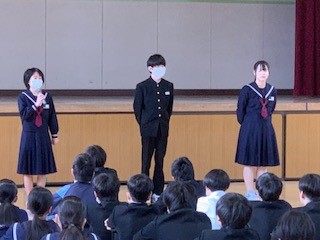 3年間行なってきた朝の定例学年集会も今日が最後となります。学級代表からそれぞれ3年間の振り返りをしてくれました。学級代表から、「さまざまな行事を通して特に2年生後半からの成長は『時間の意識がもて逆算して物事を考えられるようになったこと』『切り替えを迅速にできるようになったこと』『当たり前のことを当たり前にできるようなったこと』だと思います。残り少ない学校生活を、最後の学年目標『全ての出会いに感謝し、学年一丸となって卒業しよう』から、普段(力)のことをしっかり考え、何気ない日常を味わいながら残りの学校生活を過ごそう」と話がありました。