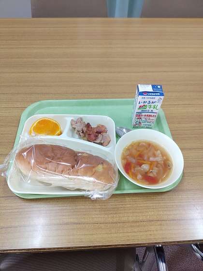 今日の献立は、パン、牛乳、鶏肉とじゃがいものガーリック焼き、ウィンナーとてぼ豆のスープ、デコポンです。
