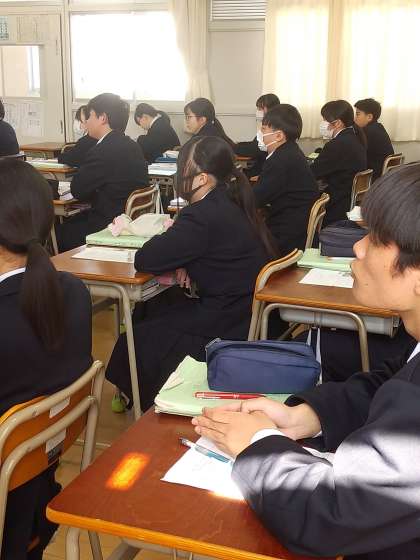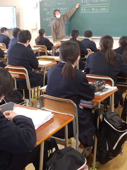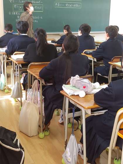 電力や電力量および熱量の計算式について学習しました。日常生活でよく見かける例を出しながら分かりやすく工夫された授業でした。