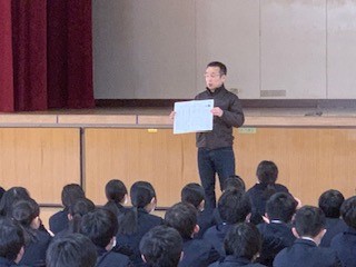 定例の2年学年集会です。進路主事の神谷先生から来年の進路獲得に向けてその心構えと予定についてお話しがありました。