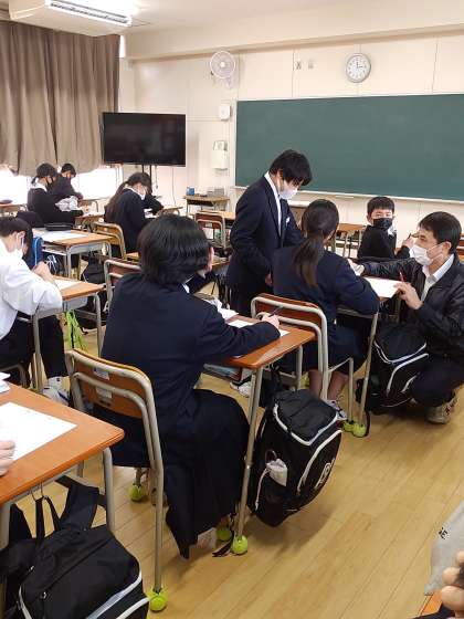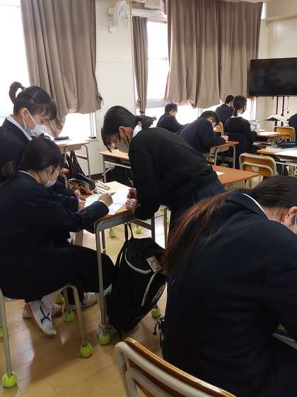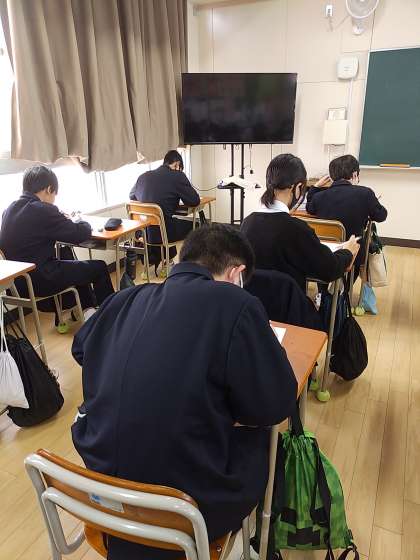 入試問題にチャレンジしました。分からないところは互いに教え合いながら進めていきました。2年後には解けるようになっているように、日々頑張っていきましょう。
