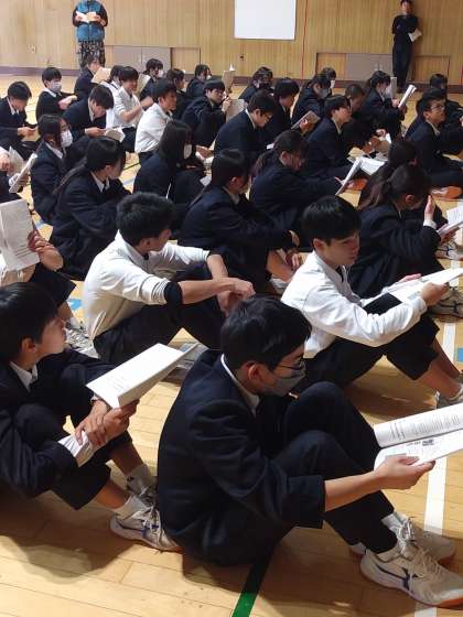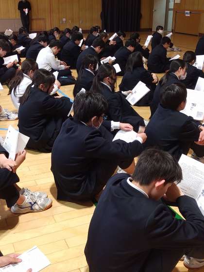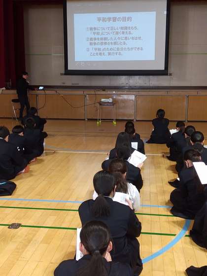 3年生で実施する修学旅行で広島方面に行きます。修学旅行での活動の基礎知識として、太平洋戦争の歴史的な背景などの学習を行いました。歴史的事実を確認しながら話を進めていきました。生徒はもっている知識とすり合わせながら、先生の話を聞いていました。