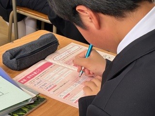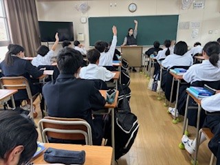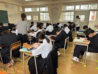 3組は英語です。授業の初めに先生からの、今日の起床時間、朝食のメニュー、体調など英語での問いかけに答えます。
