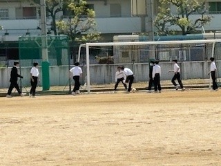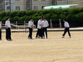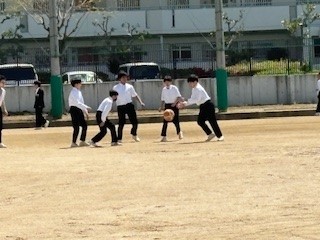 心地よい風と雲一つない青空のもと、給食後に運動場ででバレーボールやサッカー、バラあてで楽しく遊んでいます。