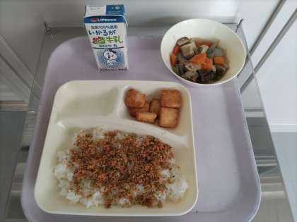 米飯、牛乳、鶏肉とじゃがいもの煮もの、あつあげのしょうゆだれがけ、紅さけそぼろ
