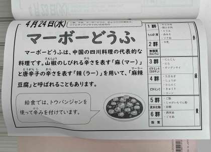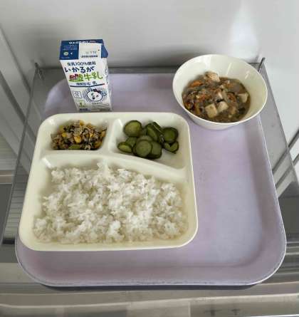 米飯、牛乳、マーボーどうふ、きゅうりの中華あえ、ツナとチンゲンサイのいためものです。
