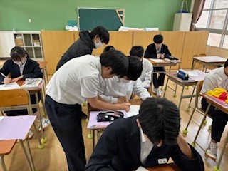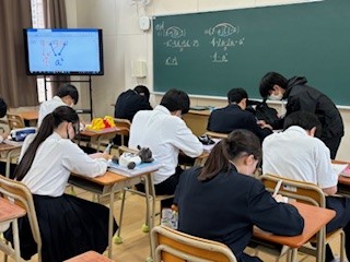 3年1組は数字です。習熟度別分割授業を行っています。分配法則や乗法公式を使っていろいろな式の展開・因数分解について演習問題に取り組みました。