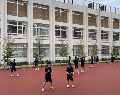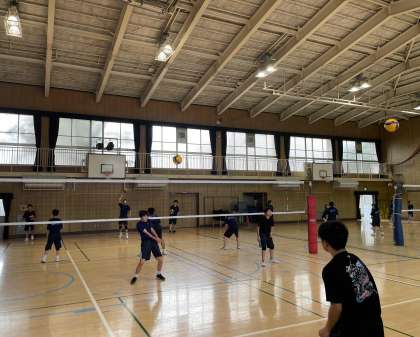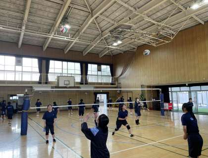 体育館では男女バレー部、中庭ではバドミントン部が活動しています。