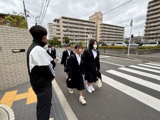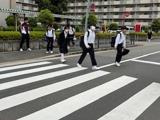 曇天でひんやりとする朝ですが、子どもたちは元気に挨拶を交わして登校です。