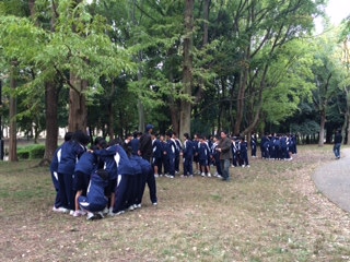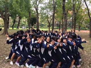 本日は1年生が地下鉄を利用して大阪城方面に校外学習に行きました。写真は大阪城公園での「人間知恵の輪」づくりの様子です。