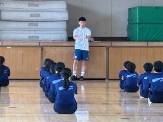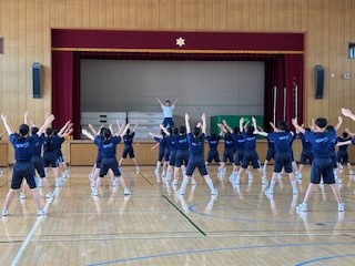 ラジオ体操第2を一つずつの動作、補強箇所など確認し正確に行うため、藤田先生の模範と掛け声で行いました。