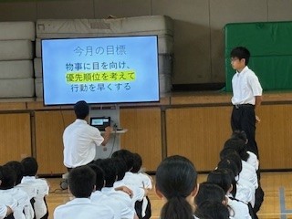 学級代表から「今月の学年目標と今未来手帳への記入の仕方」について電子黒板を使用して話がありました。
