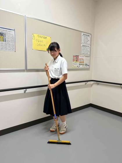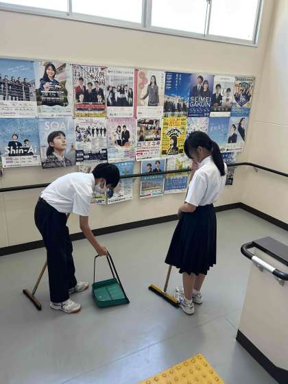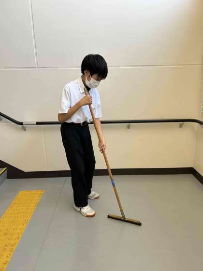 2年3組の生徒が南館東側階段の掃き掃除をしてくれています。