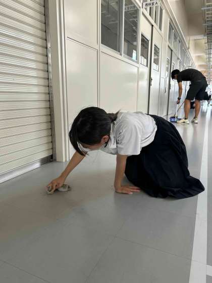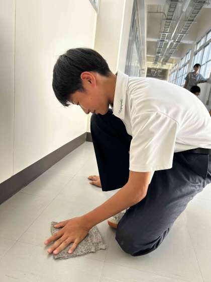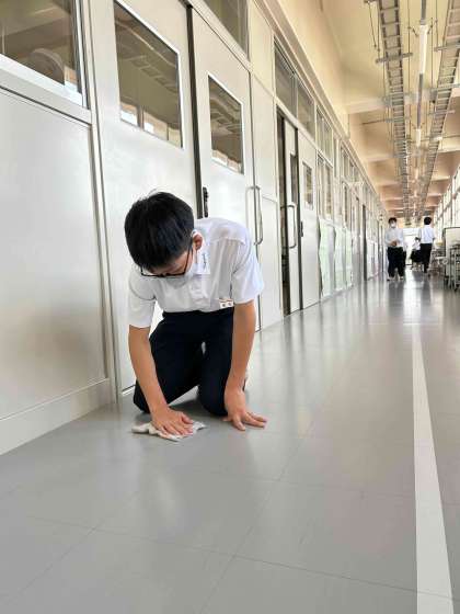2年2組の生徒が南館廊下の拭き掃除をしてくれています。
