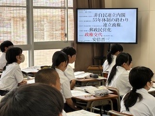 冷戦後の日本の単元で、「55年体制終焉後の政治体制」「バブル経済崩壊後の不況」「これからの接続可能な社会に向けて」について学習しました。