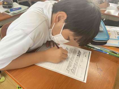 万博調べ学習、美術のレタリング、漢字テスト勉強等、各々が課題を見つけ、取り組んでいます。