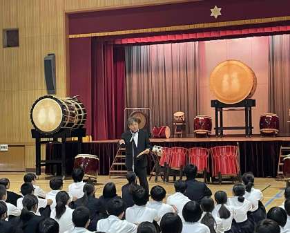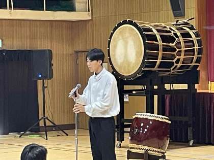 今回は学校公演として長吉中学校に来ていただきました。今日はあえて椅子を配置しなかったのはライブだからこそ感じることができるこの伝統の音を、音圧を、目で、耳で、そして身体全体で直接体感したもらうためです。